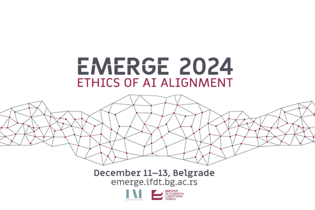 Institut za filozofiju i društvenu teoriju Univerziteta u Beogradu i Institut za istraživanje i razvoj veštačke inteligencije Srbije organizuju Međunarodnu konferenciju i forum EMERGE 2024: Etika uspostavljanja veštačke inteligencije, koja će se održati od 11. do 13. decembra u Beogradu.