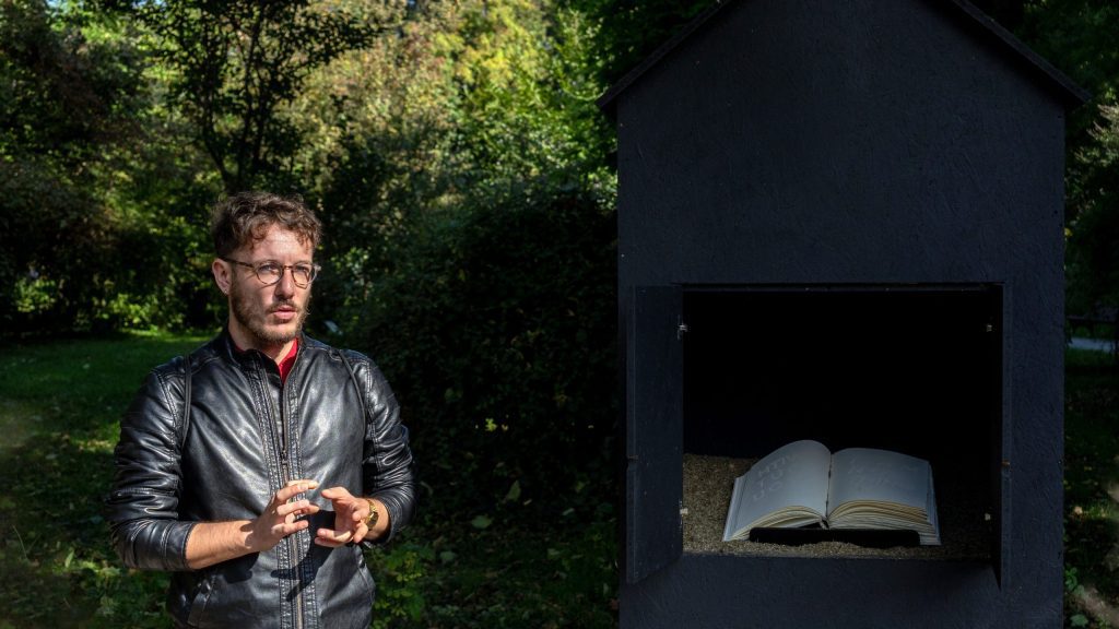 „Neverovatno, čak se dovde oseti kako miriše“, kaže Nikola Radosavljević, dok sedimo na klupi u Botaničkoj bašti „Jevremovac“, nedaleko od njegove instalacije u obliku crne, drvene kućice. U njoj je, na mekanoj podlozi od osušenog čaja majčine dušice, udobno smeštena neobična knjiga, na čijim stranicama su grafičkom tehnikom suve igle izvezene reči.
